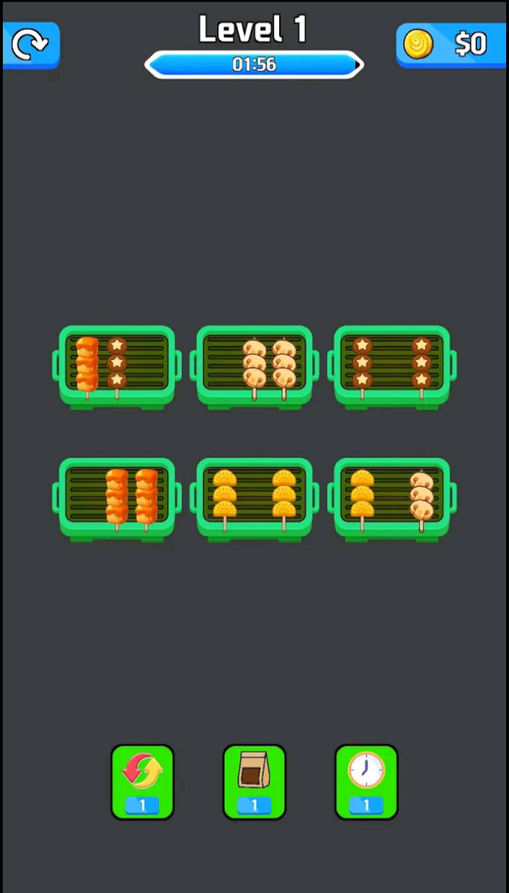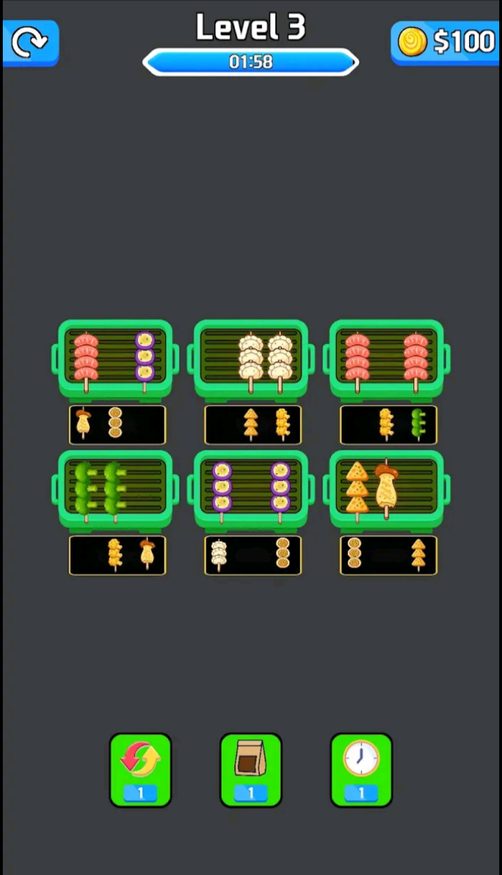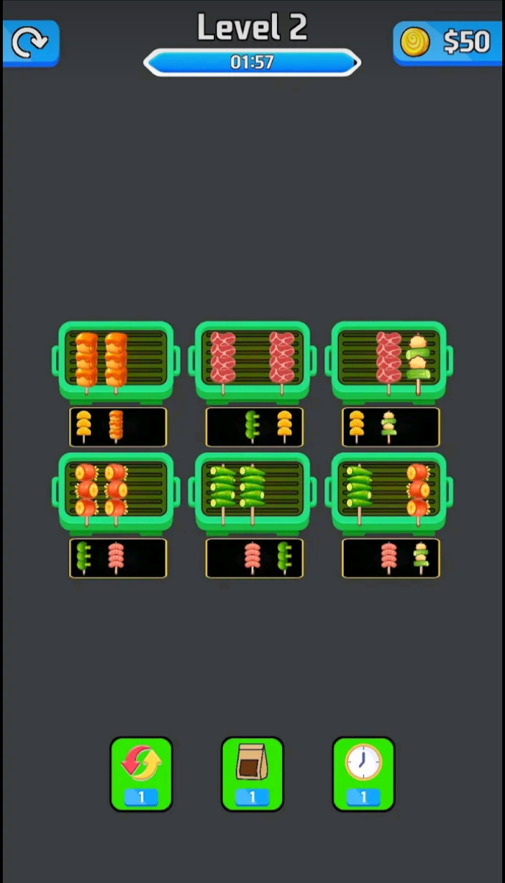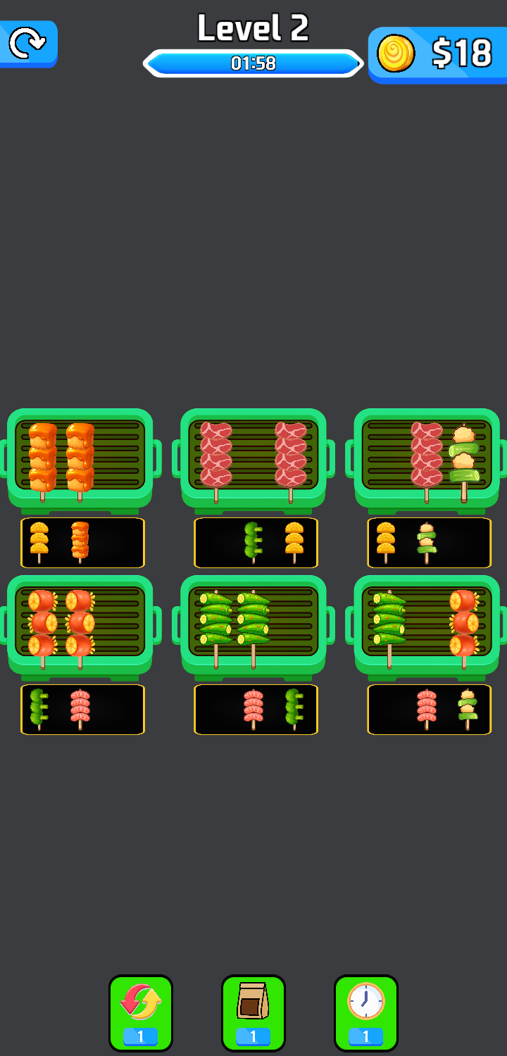 Each level presents a new challenge with different food types, layouts, and limited space. Think ahead, plan your moves carefully, and enjoy the satisfying feeling of perfectly arranged skewers.